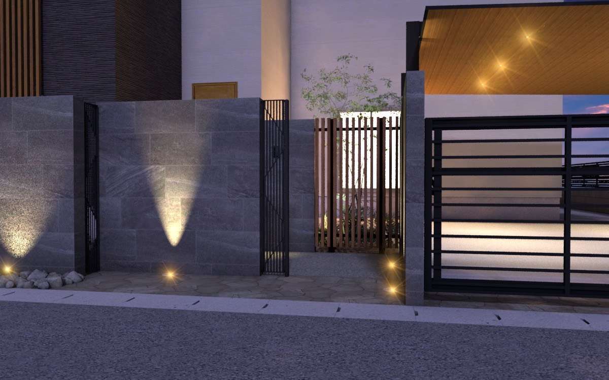 またより周りと差が出るポイントとして壁面の埋設型のグランドライトを取り入れれば夜足元が暗くないようにしつつ、壁面を照らすことで陰影が生まれ、昼間とはまた全く違う表情になります。