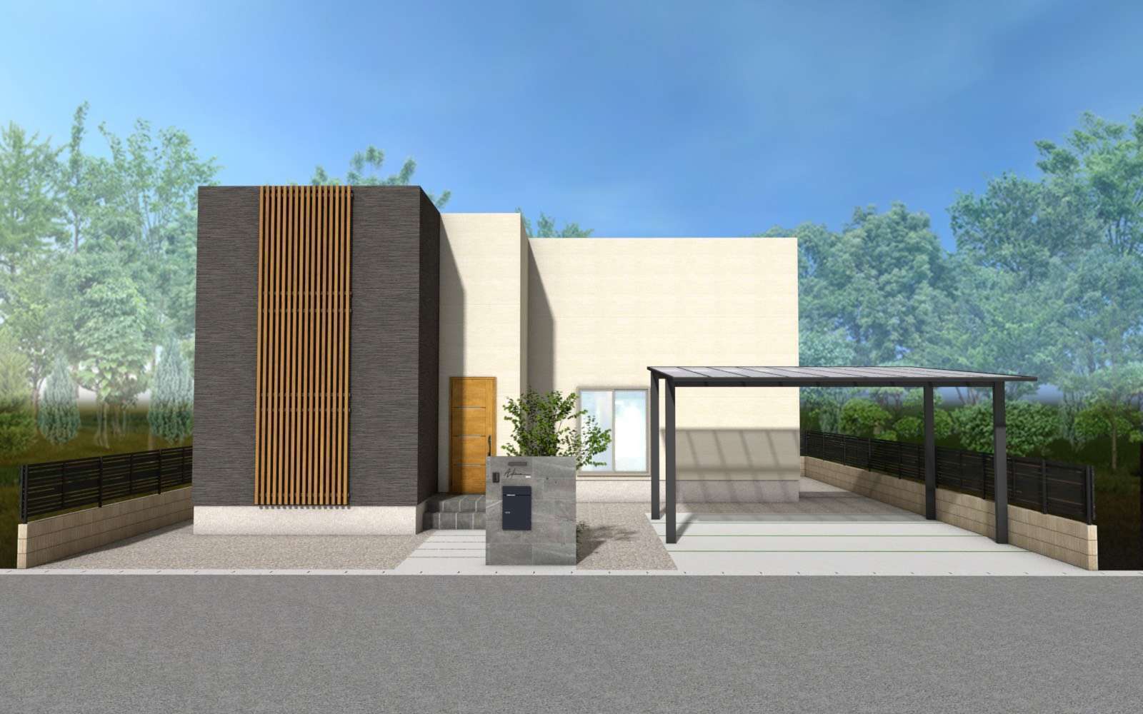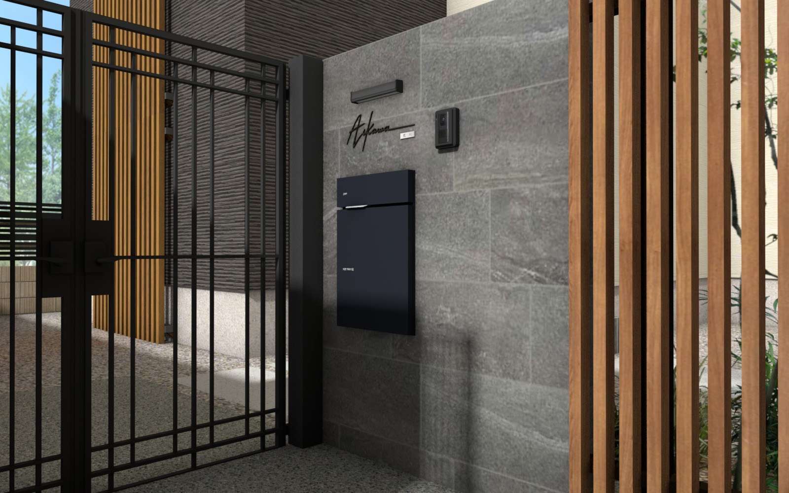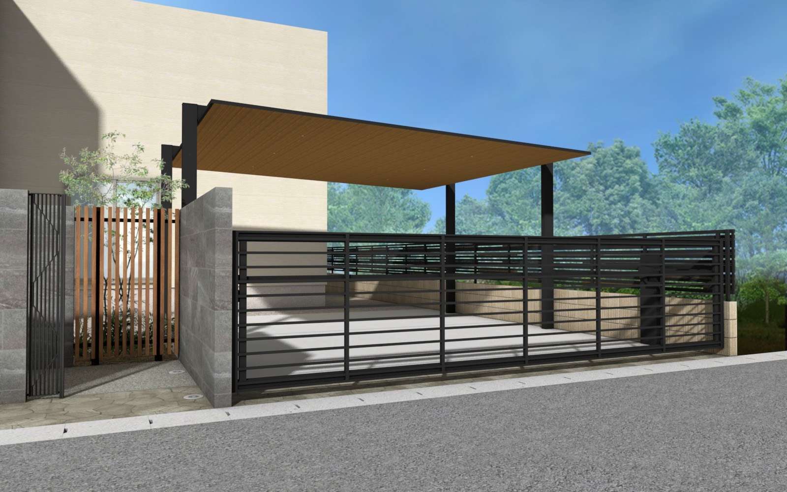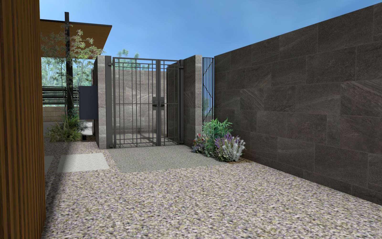 まず建物と調和するように門やカーポート、格子フェンスで黒と木目を使い取り入れてみました。