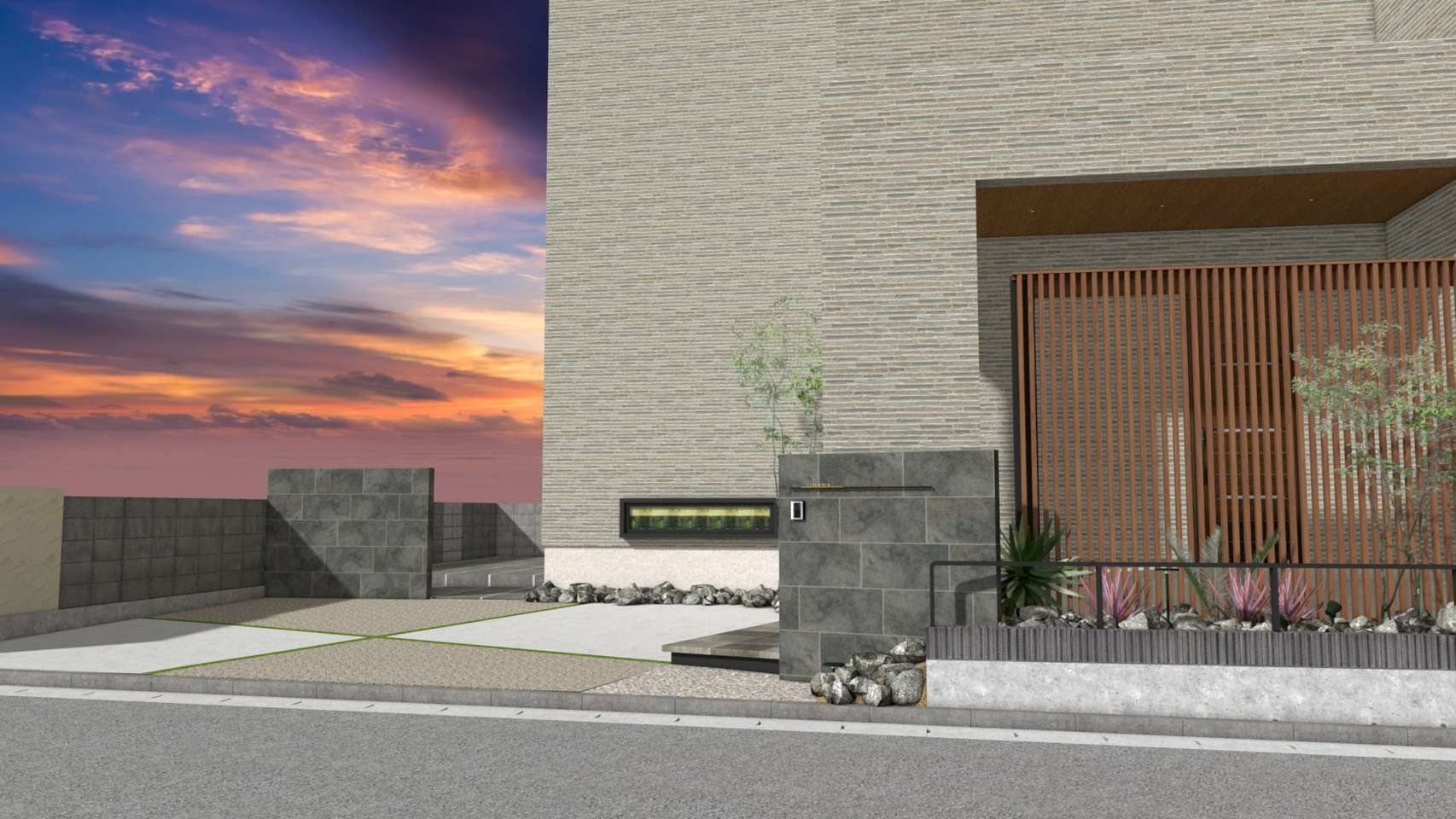 白い門柱に木調の縦格子スリット、足元にドライガーデン風の植栽。